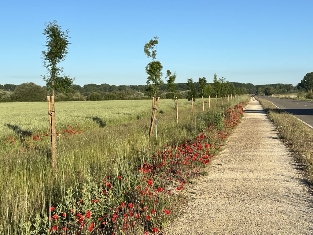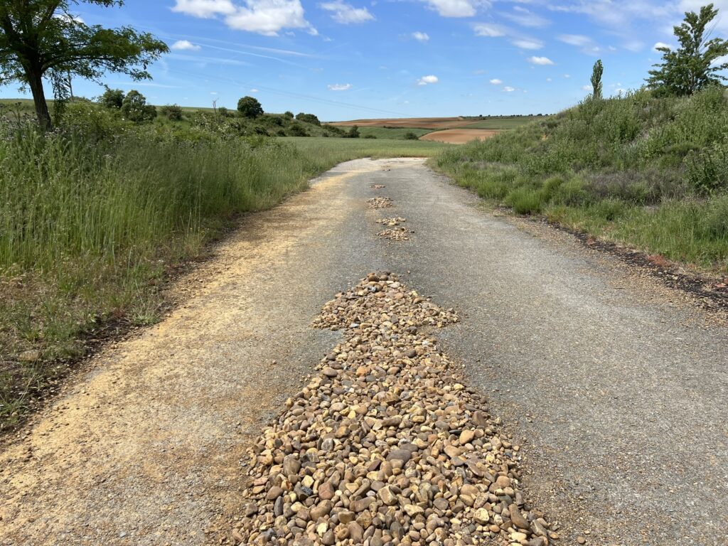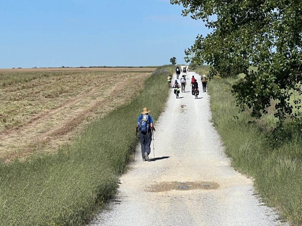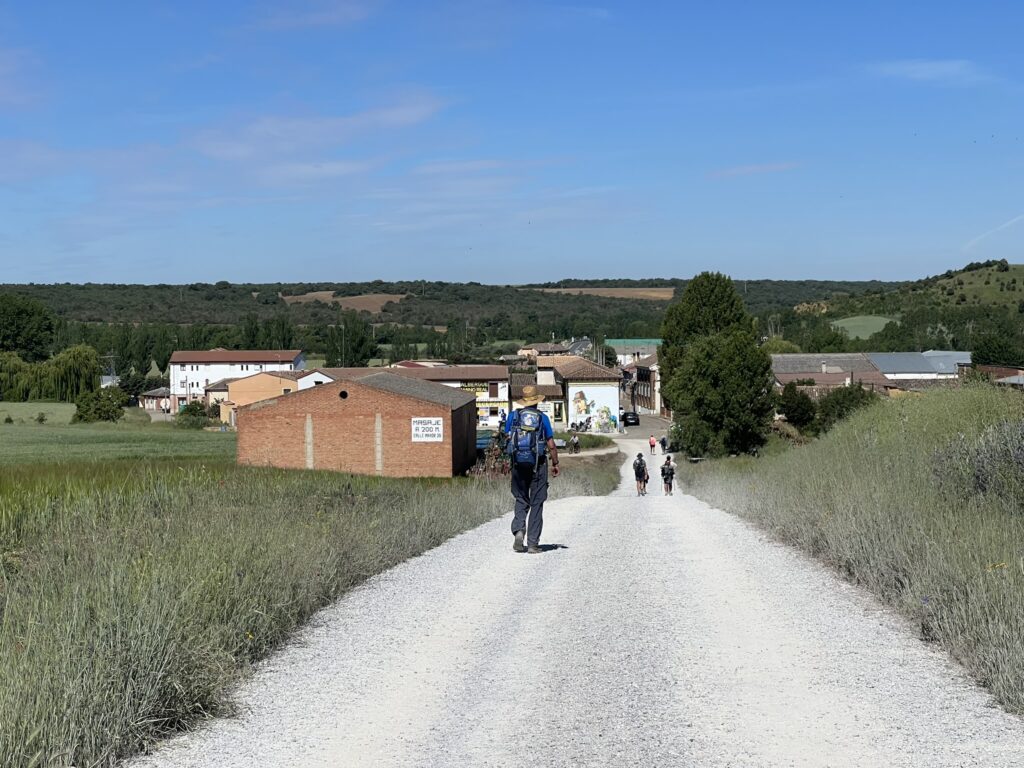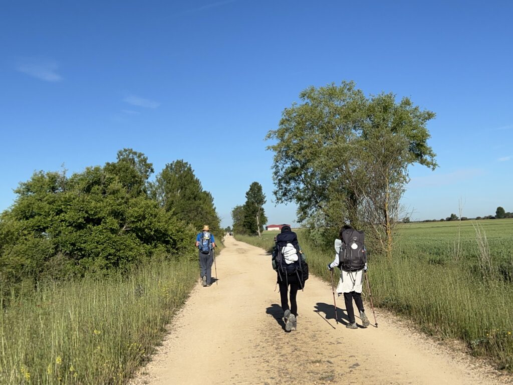 Lepo sobo v hotelu San Zoilo zapustiva okoli 7h. Seveda je Ivo budil že ob 5h (po socu tukaj v Španiji ob 3:30h), da se primerno pripraviva. Vreme na poti je ves čas sončno, tako da pridobiva prve izkusnje z vročino. Pot kmalu zavije na nekdanjo rimsko pot – Calzada Romana, ki je že delno asvaltirana. Po njej greva 17km brez počitka (in to prvi dan!). Sonce seveda povzroči žejo, ki jo v prvi vasici Calzadilla de la Cueza, potešiva z vodo, saj so v središču vasice vsi bari zaprti. Drago ima nekaj težav s podplatom desne noge, ki nima prave opore v. vložku, zato hodi z manjšimi bolečinami. Najavlja se mu tudi prvi žulj.