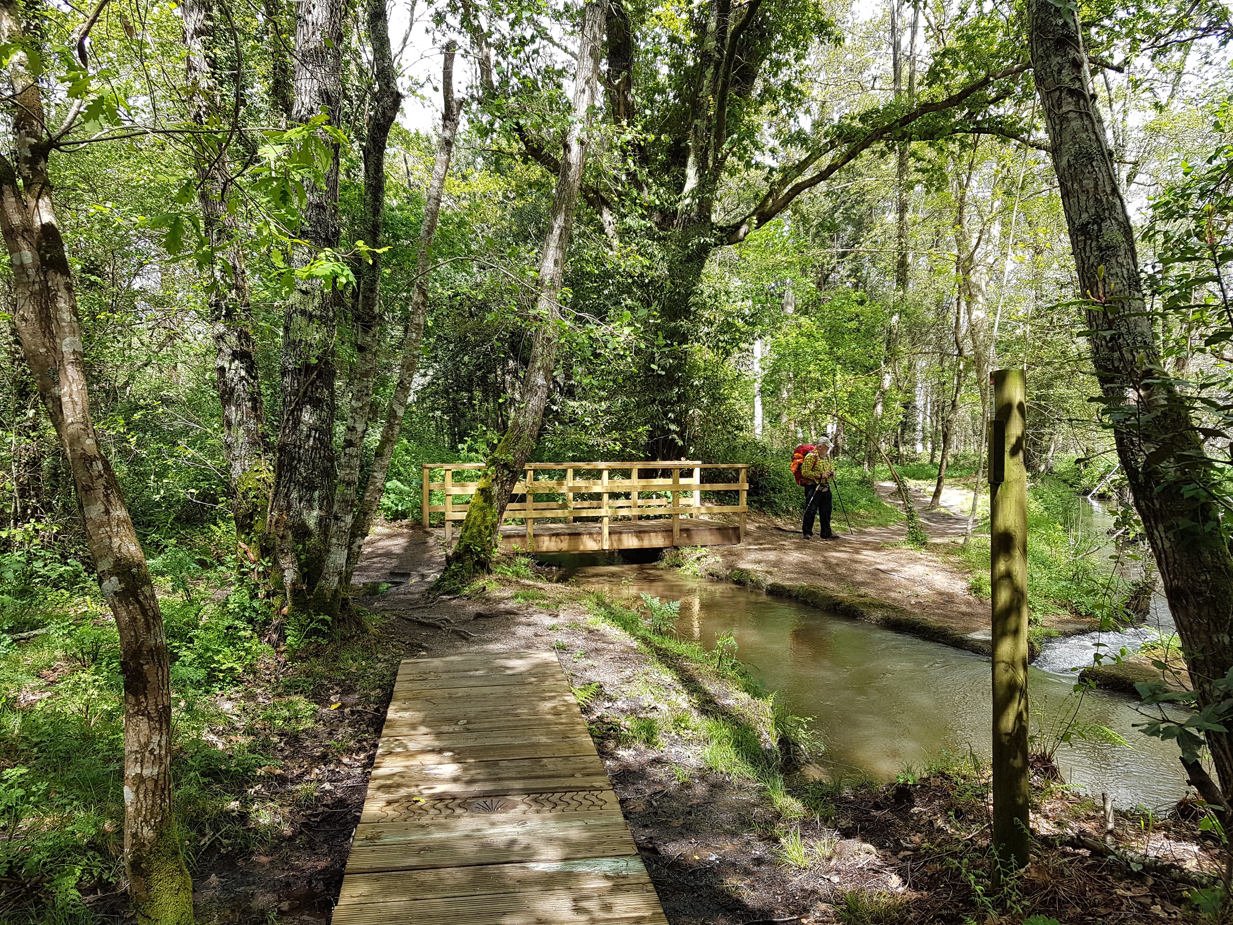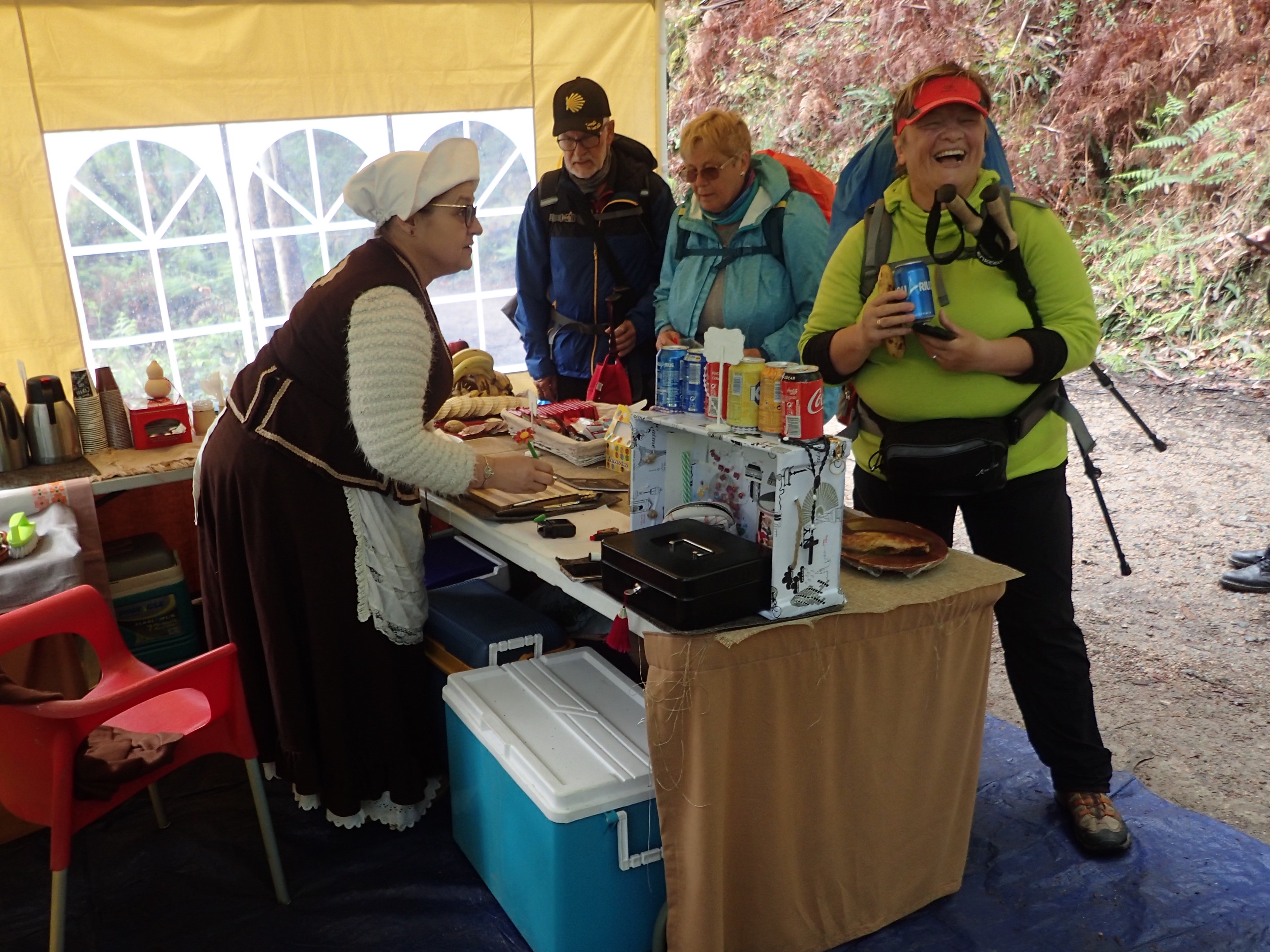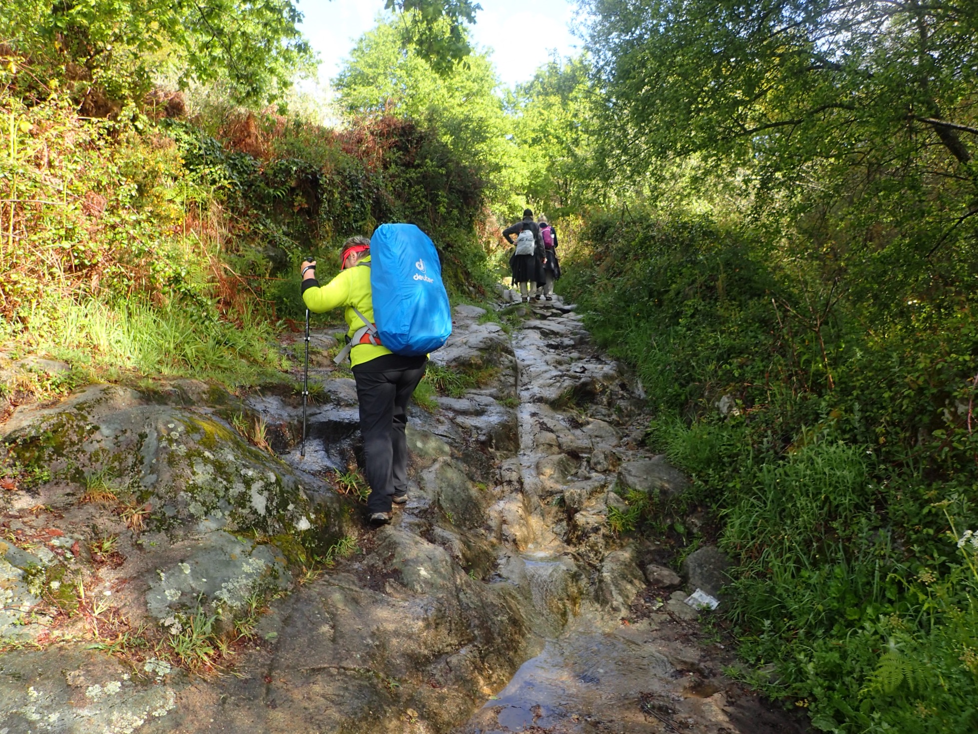 Za danes je Breda načrtovala dobrih 10 km dolgo etapo, ker je bila vremenska napoved slaba. Vendar je sonce podilo oblake, tako da je bilo vreme prav odlično za hojo. Pri mestecu Arcade so se sicer nabrali oblaki in se je pošteno ulilo, kar sva izkoristila za testiranje nove dežne opreme za Bredo, potem pa je spet zagospodovalo sonce. Naliv sva preživela ob kavi in čaju s prijazno postrežbo mladega fanta iz Kolumbije, ko je dež ponehal, sva odšla naprej. Med hojo sva se odločila, da greva še 10km naprej, do večjega mesta Pontevedra. Pot skozi Arcade je vodila preko rimskega mostu, potem pa so se načrtovalci Camina očitno odločili, da moramo videti prav vse stare hiše, in so jo speljali strmo v breg in seveda tudi strmo navzdol. Po prihodu iz mesta smo zavili v gozd in proti prelazu pred Pontevedro. Pot je bila peščena, kjer bi nočno deževje lahko pustilo blatne ovire, pa je bila tlakovana z velikimi zaobljenimi skalami. Tu pa tam je bilo pa vseeno potrebno preskočiti kako lužo. Na poti skozi po evkaliptusu dišečem gozdu se je kot fatamorgana prikazala improvizirana trgovinica s sadjem, pijačo, kavo in še mize in klopi so bile poleg. Ena banana in en Aquarius sta dala Bredi dovolj energije za nadaljevanje tega planinskega dela poti. Po prihodu v dolino sva se odločila za novo pot “camino complementario”, ki je speljana ob reki. Bila je dober kilometer daljša od uradne po cesti, vendar je bilo vredno. Čudovita narava, sveže umita od nočnega dežja. V mestu Pontevedra sva se nastanila v že preverjenem albergue Aloxa, nato pa odšla na menu del dia v restavracijo Peregrinus in po nakupih hrane za jutrišnji dan.