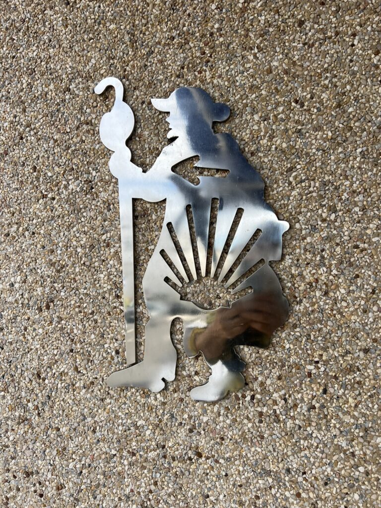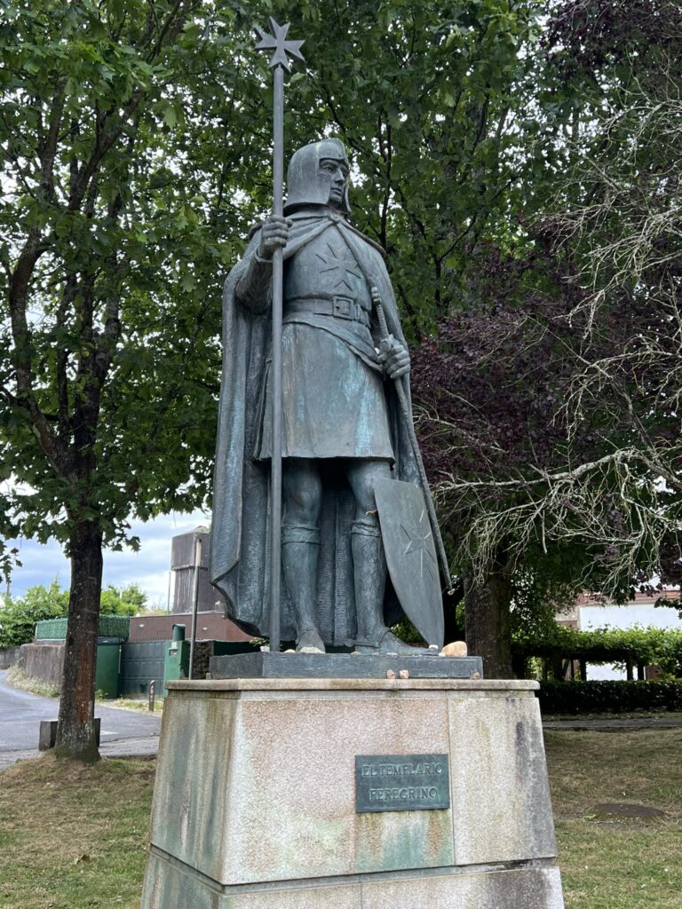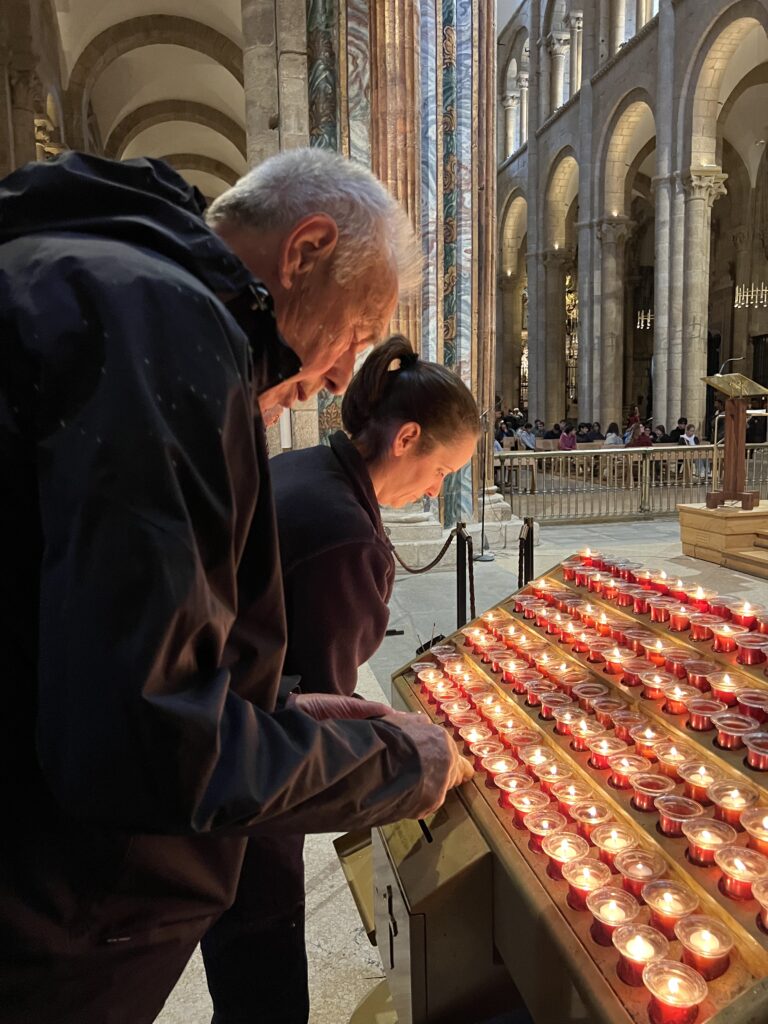 Kako malo je potrebno za zadovoljstvo: izziv 400km, pivo in sonce.V klancu naju je prehitela skupina kakih stotih kolesarjev.Lepa, vendar zelo kratkotrajna upodobitev simbola poti Camino.Moderna upodobitev komposteljskega romarja.Ena od mnogih upodobitev romarja na poti v Santiago. Tale je nameščena na steno ene od restavracij.Nekateri romarji prenočujejo v šotoru.Sopotnik naše mladosti, daleč od nekdanje Jugoslavije.Dva velika pohodnika: Ivo in Jean-Francois iz Pariza, ki se ravno vrača domov peš iz Santiaga.Velik del poti Camina poteka ob glavnih cestah.Zadnji del poti v Galiciji poteka skozi evkaliptusove gozdove, ki so načrtno zasajeni.Spomenik kot vrata v Santiago.Tale templarski romar zamuja s prihodom pred katedralo Sv.Jakoba za cca 800 let .Spominska plošča ob romanju papeža Janeza Pavla II. v Santiago.Navdučenje nad pogledom na oddaljeno katedralo v Santiagu.Še slika za tiste, ki Ivota niste prepoznali od zadaj.Skupinski pozdrav cerkvi Sv.Jakoba v oddaljenem Santiagu.Mala romarka bo nekega dne prišla sem sama z nahrbtnikom.Protokolarna slika pred katedralo Sv.Jakoba že s “compostelo” v roki (oz.žepu).Veličasten oltar katedrale Sv.Jakoba v Composteli.Kip Sv.Jakoba v glavnem oltarju katedrale Sv.Jakoba v Composteli.Sveča v zahvalo za dano možnost, da prehodiva pot in tako dokončava Camino iz leta 2023.Ivotovo veselje ob odlični hrani v restavraciji El Paptorio v Santiago de Compostela.Jakobove školjke so dopolnile veselje.Chuleta za povrh vsem školjkam.