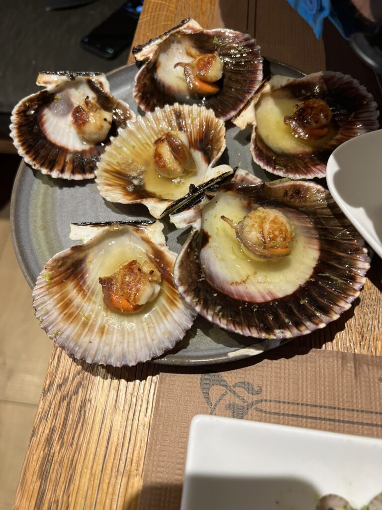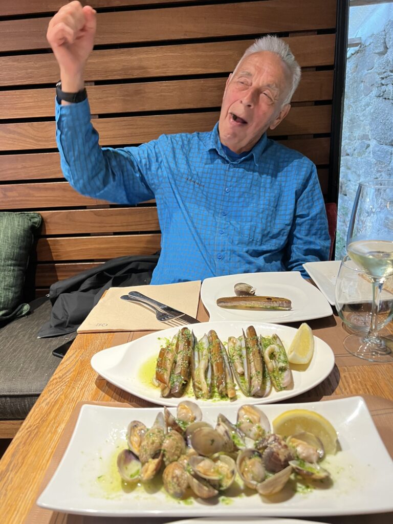 Na kosilo sva se v vasici Lavacola (prevod: pere rit) napotila v restavracijo Casa de Amancia, kjer sva odlično jedla v 2020. Pa danes ni bilo nič za naju, saj ponujajo tipično (amerikanizirano) hrano namesto takšne iz domače kuhinje (comida casera). Kupila sva pijačo in se na dvorišču restavracije zadovoljno najedla iz nahrbtnika: kruh, paradižnik (s soljo), sir, nekaj klobase še iz Kotelj ter češnje.