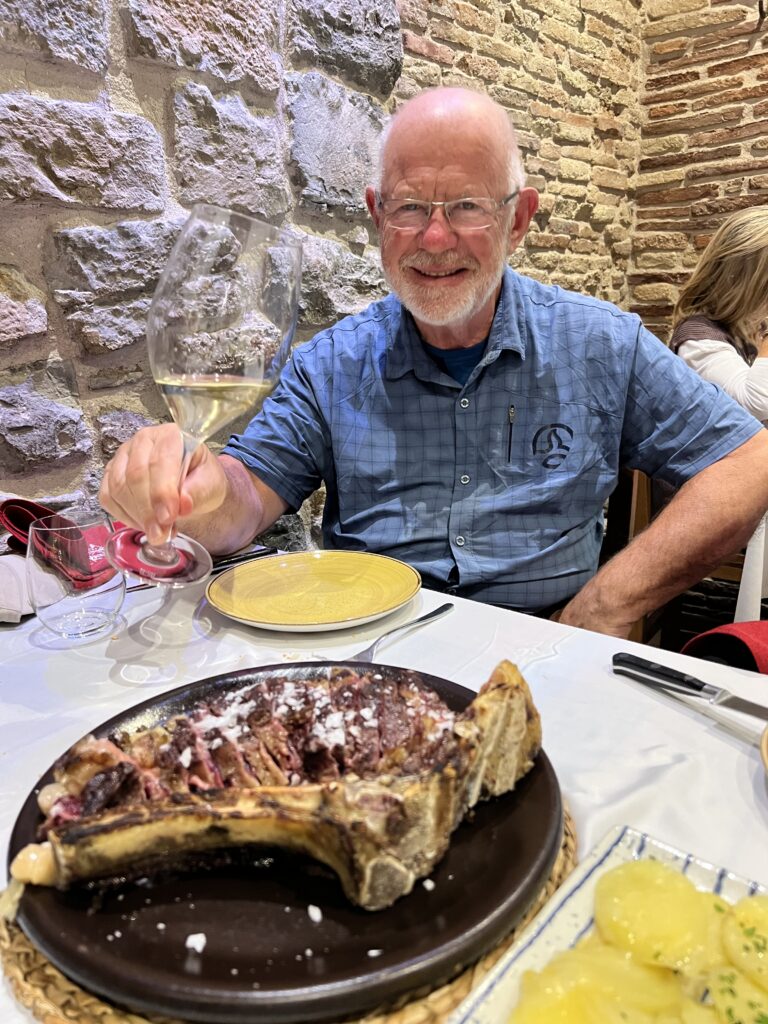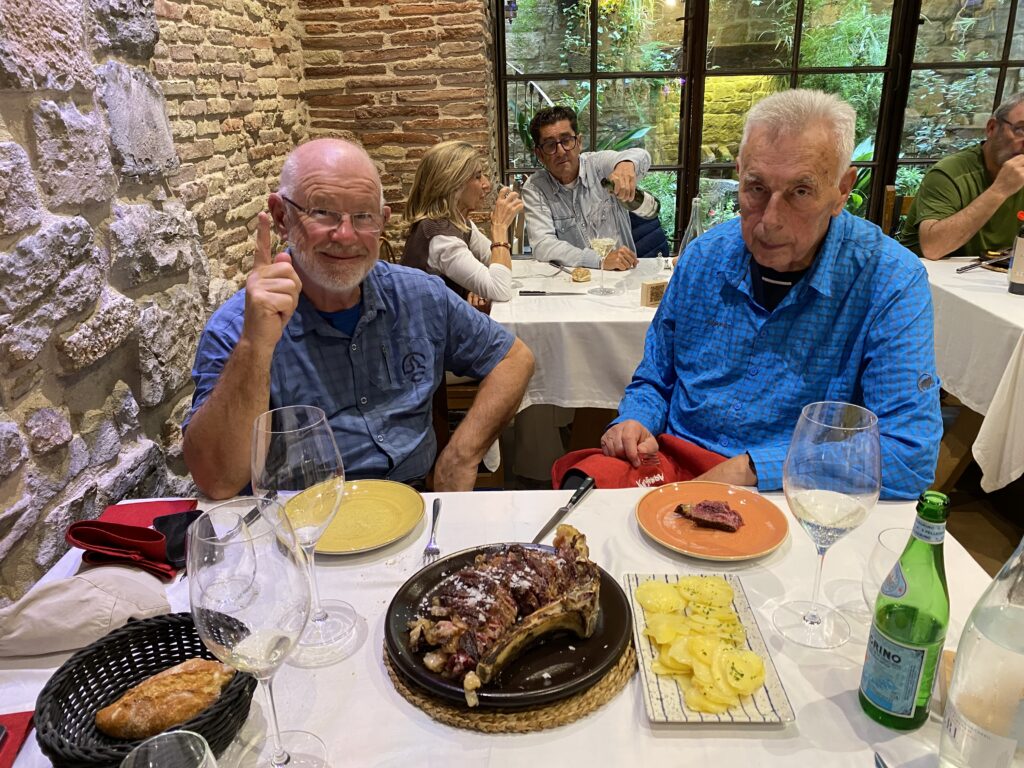 Na kosilo z Nejcem gremo v elitno restavracijo Katuzarra na Calle San Nicolas, kjer smo bili že včeraj na popoldanski malici. Kulinarična fešta od fešte: gosja jetrca na žaru, reberca jagenjčka, ogromna chuleta (goveji steak na žaru) ter na vrh steklenica vina verdeho (zelen). Dobra hrana in pijača ter prijeten pogovor so prispevali k lepemu srečanju.