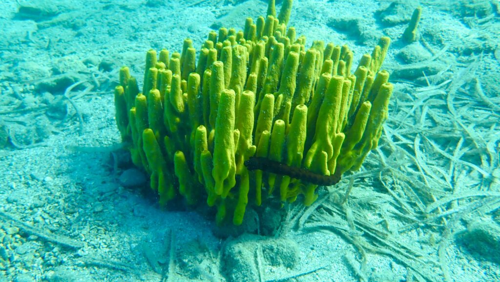 Le redko so na dnu zdravi rumeni cevkaši, ki so indikatorji zdravstvene kondicije morja. Črna zadeva je morski črv.